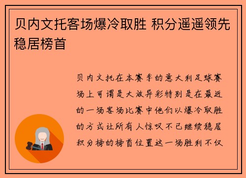 贝内文托的客场爆冷取胜无疑是本赛季最为惊艳的比赛之一,比赛中球队展现出的战术智慧、球员的个人能力以及团队的凝聚力都为他们带来了这一历史性胜利。通过这一场胜利,贝内文托不仅收获了积分,更重要的是增强了球队的信心和团队的凝聚力,进一步确立了他们作为意甲顶级球队的地位。